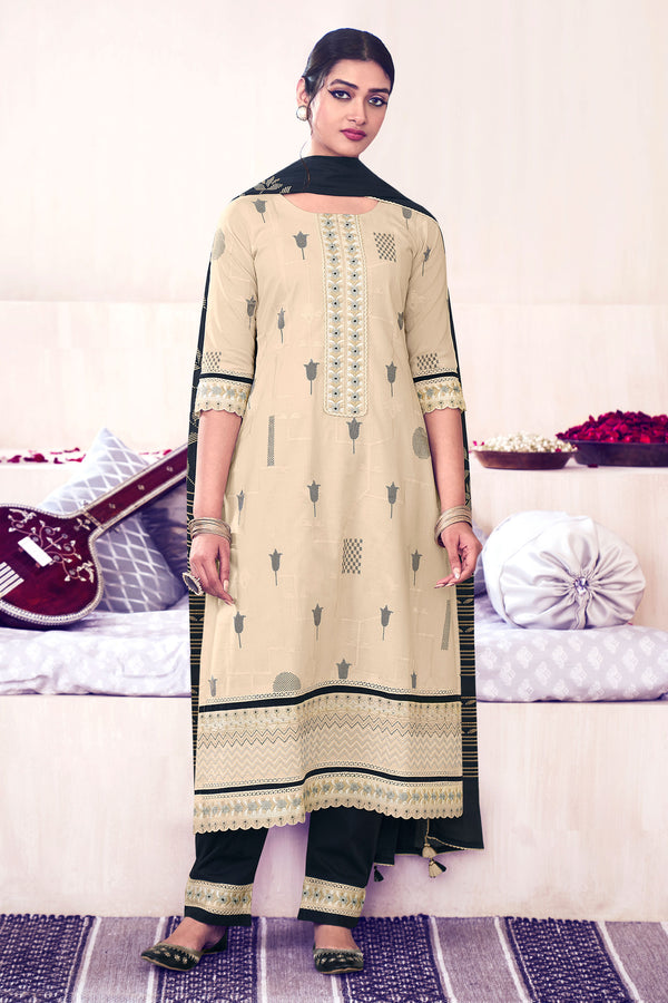 Beige Color Pure Cotton Embroidery With Block Print Long Suit