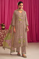 Step into elegance with this stunning Pure Premium Fancy Jacquard Georgette Salwar Kameez, perfect for festive gatherings and special occasions. The top features exquisite placement embroidery work, complemented by embroidery on the sleeves and daaman. Enhanced with intricate lace details, this piece showcases a sophisticated blend of modern and traditional design. Paired with a Pure Muslin Silk bottom adorned with print patti and a matching digital print muslin silk dupatta, this outfit delivers both style and comfort. Ideal for those who seek an elegant, high-quality ensemble.