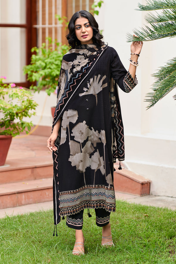Introducing our Black Color Pure Premium Corduroy Digital Print Long Straight Cut Salwar Kameez. This exquisite set features a beautifully crafted top with intricate embroidery and elegant print patti detailing on the daaman and sleeves. The bottom is a solid color pure premium corduroy, accentuated with a stylish print patti. Complete the look with our fine pure pashmina digital print dupatta, adorned with graceful lace and decorative hangings. Perfect for festive occasions and special events, this salwar kameez set exudes sophistication and timeless style.