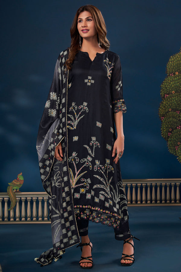 Step into elegance with our Pure Burberry Silk Digital Print Designer Salwar Kameez. This outfit exudes sophistication, featuring a top crafted from pure Burberry silk adorned with intricate digital prints, detailed handwork, and fine embroidery on the daaman and sleeves. Complementing the top, the bottom is made from luxurious muslin silk in a solid color enhanced with a printed patti design. The look is elevated by a digitally printed fine muslin dupatta, finished with a stylish lace border and decorative hangings. Perfect for formal functions and celebrations, this ensemble embodies traditional charm with a touch of modern grace. Please remember to dry clean only and allow for slight color variations.