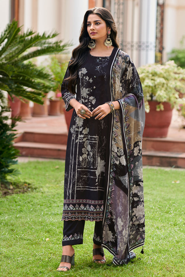 Introducing our Black Color Pure Premium Corduroy Digital Print Long Straight Cut Salwar Kameez. This exquisite set features a beautifully crafted top with intricate embroidery and elegant print patti detailing on the daaman and sleeves. The bottom is a solid color pure premium corduroy, accentuated with a stylish print patti. Complete the look with our fine pure pashmina digital print dupatta, adorned with graceful lace and decorative hangings. Perfect for festive occasions and special events, this salwar kameez set exudes sophistication and timeless style.