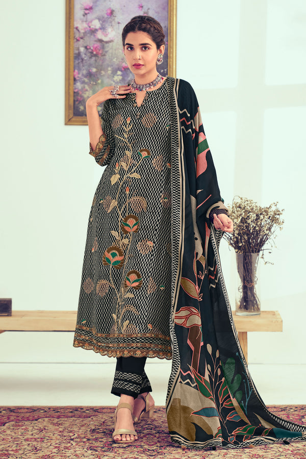Fashion meets tradition with this Black Color Pure Muslin Silk Jacquard Digital Print Designer Salwar Kameez, a party-wear ensemble sure to enhance your charm. The digitally printed top is delicately embroidered, ensuring you become the talk of the evening. Contrasting this is the solid color bottom, designed from the pure Moga Silk, featuring a tastefully positioned print patti. The elegant dupatta, showcasing a Digital Print on Pure Sushi, accessorized with stylish hangings and a pre-stitched lace, completes your look. Be a picture of elegance!