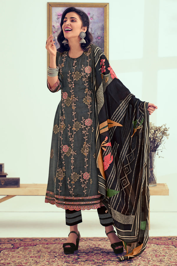 Elevate your ethnic fashion sense with our stunning Black Color Pure Muslin Silk Jacquard Digital Print Party Wear Designer Salwar Kameez. A fabulous fusion of traditional craftsmanship and modern styling, this suit set will help you make a striking appearance at any party or event. It features a beautifully designed top, made of pure Muslin Silk Jacquard. Intricately designed with a fancy placement embroidery, this top exudes a touch of glamor. It is complemented by a solid color bottom made of pure Moga Silk that's elegantly designed with a print patti. Topping off the ensemble is a digital print Dupatta crafted from pure Sushi, adorned with hanging elements and readymade lace. Make heads turn with your graceful look!