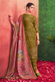 Flaunt your elegant taste with the Pure Muslin Silk Gold Lining Digital Print Long Straight Cut Salwar Suit. The stunning muslin silk top radiates with its digital print, enhanced with gold lining and mukaish work, and delicately balanced by the detailed print and embroidery patti on daaman and sleeves. This pairs harmoniously with the solid-coloured pure muslin bottom that's garnished with a striking printed patti. Lastly, the gold-lined muslin dupatta lends the outfit a splendid finishing touch with its digital print and decorative lace and latkan accents.