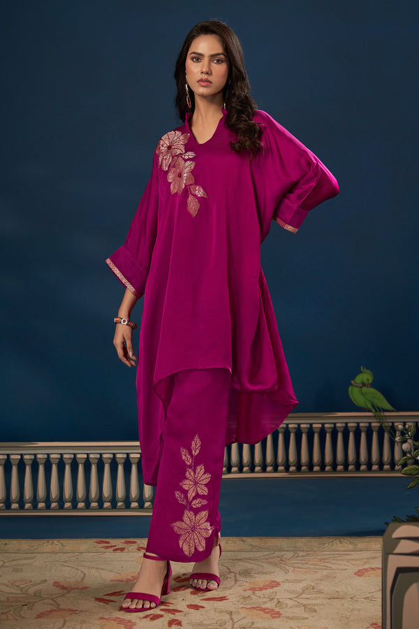 Magenta Satin Jacquard Patch Work Readymade Top With Bottom