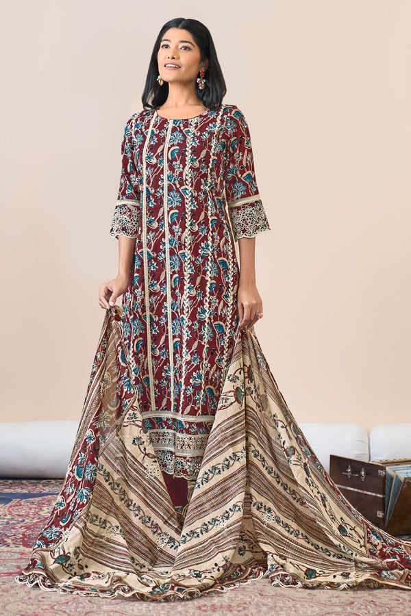 Maroon Pure Cotton Block Print With Fancy Borer Embroidery Work Long Dress