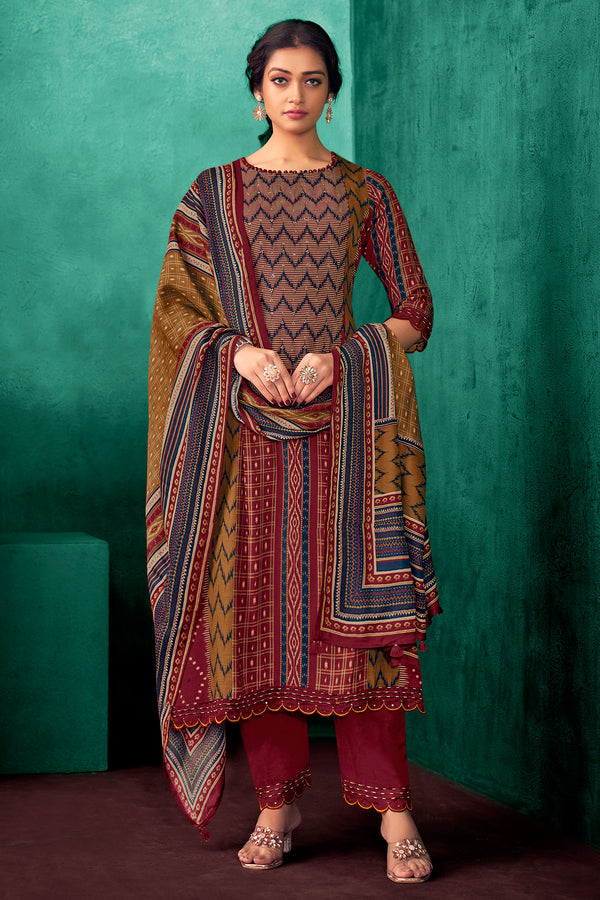 Explore our latest collection of the pure Pashmina Digital Print Casual Salwar Kameez. An absolute symbol of elegance, the ensemble features a purely crafted Pashmina top embellished with traditional Mukaish work and embroidery details on Daaman and sleeves. It comes with a dyed Pashmina bottom, simple in solid colour yet ornamental with its embroidery Patti. Tying the look together is the sumptuous pure Pashmina Dupatta boasting a stylish digital print and complemented by decorative hangings for that extra finesse. Wrap yourself in this exceptional piece and command attention at any occasion.