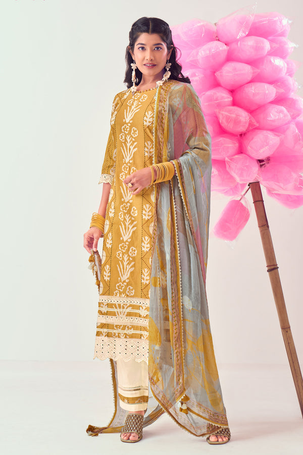 Mustard Pure Cotton Katha Work With Hand Block Print Casual Salwar Suit