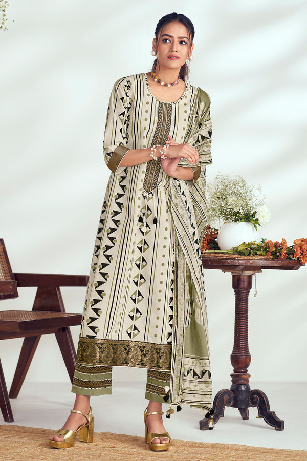 Step out in elegance with this Pure Cotton Block Print Long Straight Cut Salwar Kameez. The top features intricate Banarasi Jacquard Patti detailing on the neck, hem, and sleeves, making it perfect for festive occasions. Paired with a solid color pure cotton bottom, the outfit is as comfortable as it is stylish. The ensemble is completed with a pure mal mal cotton dupatta that boasts digital prints, fancy lace, and hangings. Perfect for traditional events, this salwar kameez set brings together heritage craftsmanship and modern design for a look that is both timeless and contemporary.