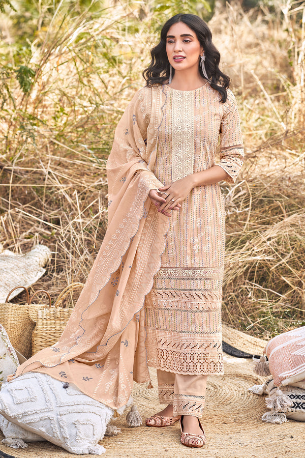 Introducing our elegantly crafted Pure Cotton Khadi Block Print Salwar Kameez - an ideal ensemble for functions and gatherings. The top features intricate Katha work, complimented by borer embroidery and delicate lace work, delivering an epitome of style and grace. The solid-coloured bottom, made of pure cotton, is decorated with lace and borer embroidery. Complementing this ensemble is a pure mal mal cotton dupatta showcasing Khadi block print, accompanied by strategic borer embroidery, scallop embroidery and whimsical latkan. Step into elegance and style with this chic outfit.