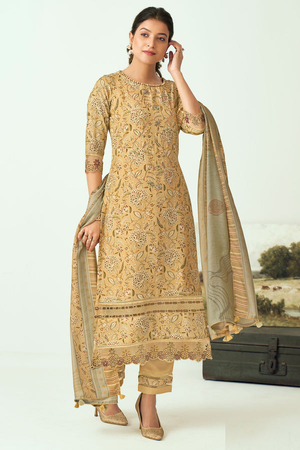 Elevate your ethnic wardrobe with this luxurious designer salwar suit, perfect for making a statement at any festive occasion or special event. Crafted from pure muslin silk, this top boasts an enchanting digital print adorned with intricate handwork. The daaman and sleeves feature elegant embroidery patti, adding a touch of sophistication to your ensemble., The pure muslin silk bottom is equally captivating with its exquisite print and delicate lacework, ensuring a seamless blend of comfort and style. Complementing the ensemble, the pure sushi voil dupatta showcases a stunning digital print, enhanced by lace detailing and fancy hangings, making it a perfect finishing touch to this designer outfit.