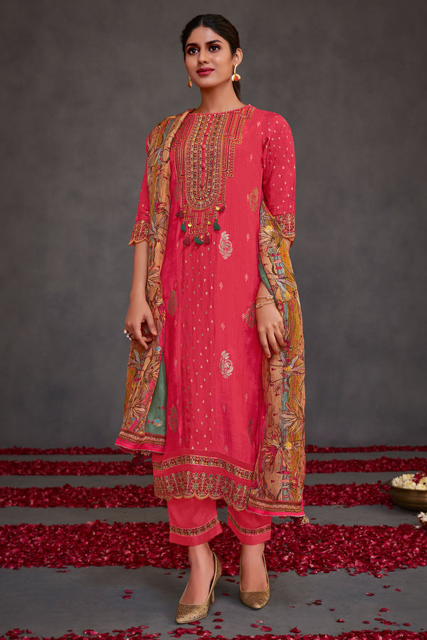 Display ultimate style and grace with this Pure Muslin Silk Jacquard Designer Salwar Kameez showcasing an exquisite gold print patchwork on the top. Adding allure to the outfit is the fancy embroidery and decorative latkan. A perfect contrast is the pure satin solid colour bottom boasting sophisticated embroidery. Complimenting the outfit is a pure Organza Jacquard dupatta digitally printed with elegant lace and latkan, lending a festive flair to the outfit. This classy piece ensures a show-stopping presence at any event.