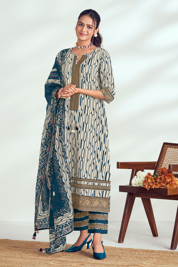Step out in elegance with this Pure Cotton Block Print Long Straight Cut Salwar Kameez. The top features intricate Banarasi Jacquard Patti detailing on the neck, hem, and sleeves, making it perfect for festive occasions. Paired with a solid color pure cotton bottom, the outfit is as comfortable as it is stylish. The ensemble is completed with a pure mal mal cotton dupatta that boasts digital prints, fancy lace, and hangings. Perfect for traditional events, this salwar kameez set brings together heritage craftsmanship and modern design for a look that is both timeless and contemporary.