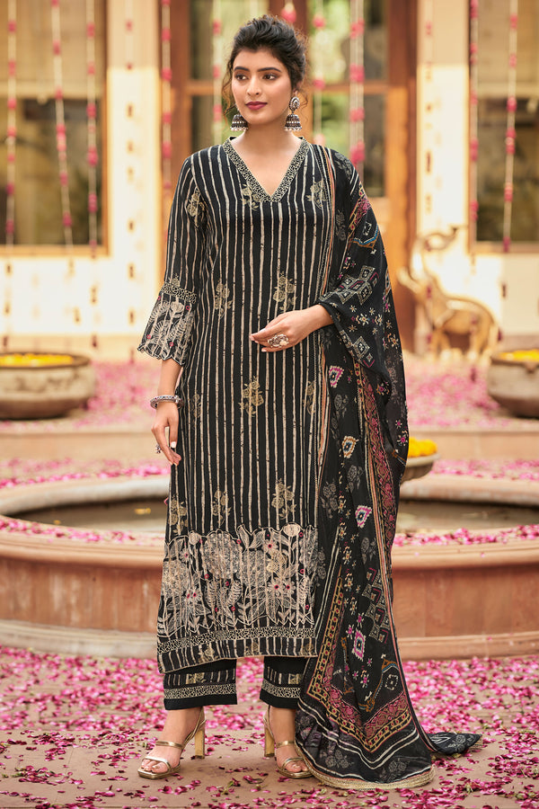 Elevate your ethnic wardrobe with this stunning Black Color Pure Muslin Jacquard Digital Print Salwar Kameez. The top features intricate fancy embroidery on the daaman and sleeves, made from luxurious pure muslin jacquard fabric. The solid-color bottom, also in pure muslin, is accentuated with a sophisticated print and elegant embroidery patti. Complementing the ensemble is a pure chinon silk dupatta adorned with a digital print, finished with fancy readymade lace and charming hangings. Ideal for festive occasions, weddings, and family gatherings, this set is a timeless addition to any fashionista's collection.