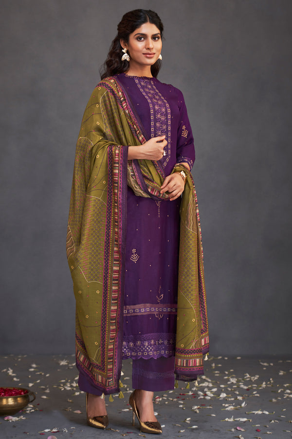 Purple Pure Bemberg Silk Gold Print Straight Cut Suit