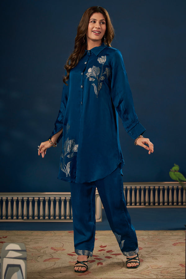 Teal Satin Jacquard Patch Work Readymade Top With Bottom